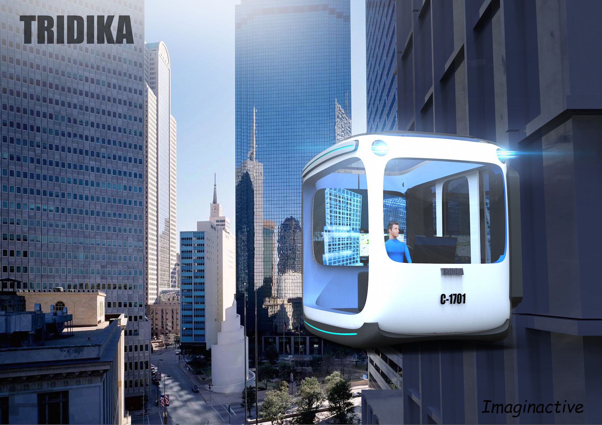 Une fois au sol, le Tridika peut fonctionner comme une voiture autonome qu’on peut littéralement garer à côté de son salon. Il n’a pas de roues, car il fonctionne sur le même principe que le train Maglev : des aimants soulèvent et propulsent le véhicule, qui tire son énergie des rails.