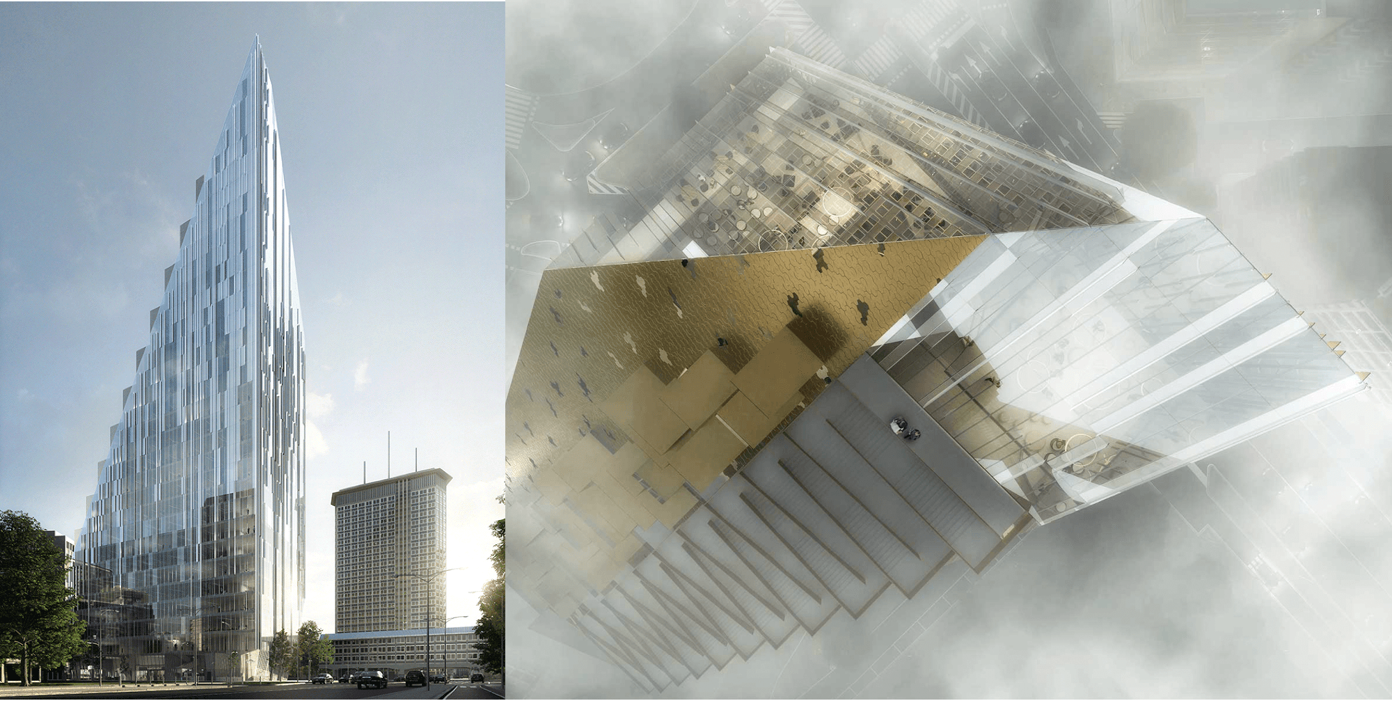 Le bâtiment part d’une base assez large pour finir en pointe vers le ciel, ne faisant plus qu’une ligne. En fonction de l’orientation de la perspective, l’immeuble prend une toute autre forme (diagonale d’un versant, verticale de l’autre), les différents étages se succèdant en un ensemble d’espaces collectifs définis (salles de réunion, lieux de convivialité, etc.).