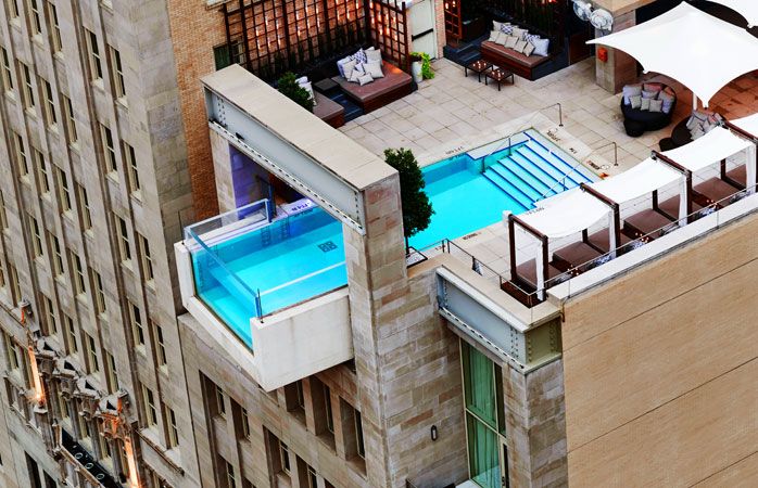 Sur le toit de l’hôtel Joule à Dallas, un hôtel de luxe situé dans un gratte ciel, se trouve une piscine accueillante qui se distingue par sa partie construite en porte à faux, au-delà du bord du bâtiment.